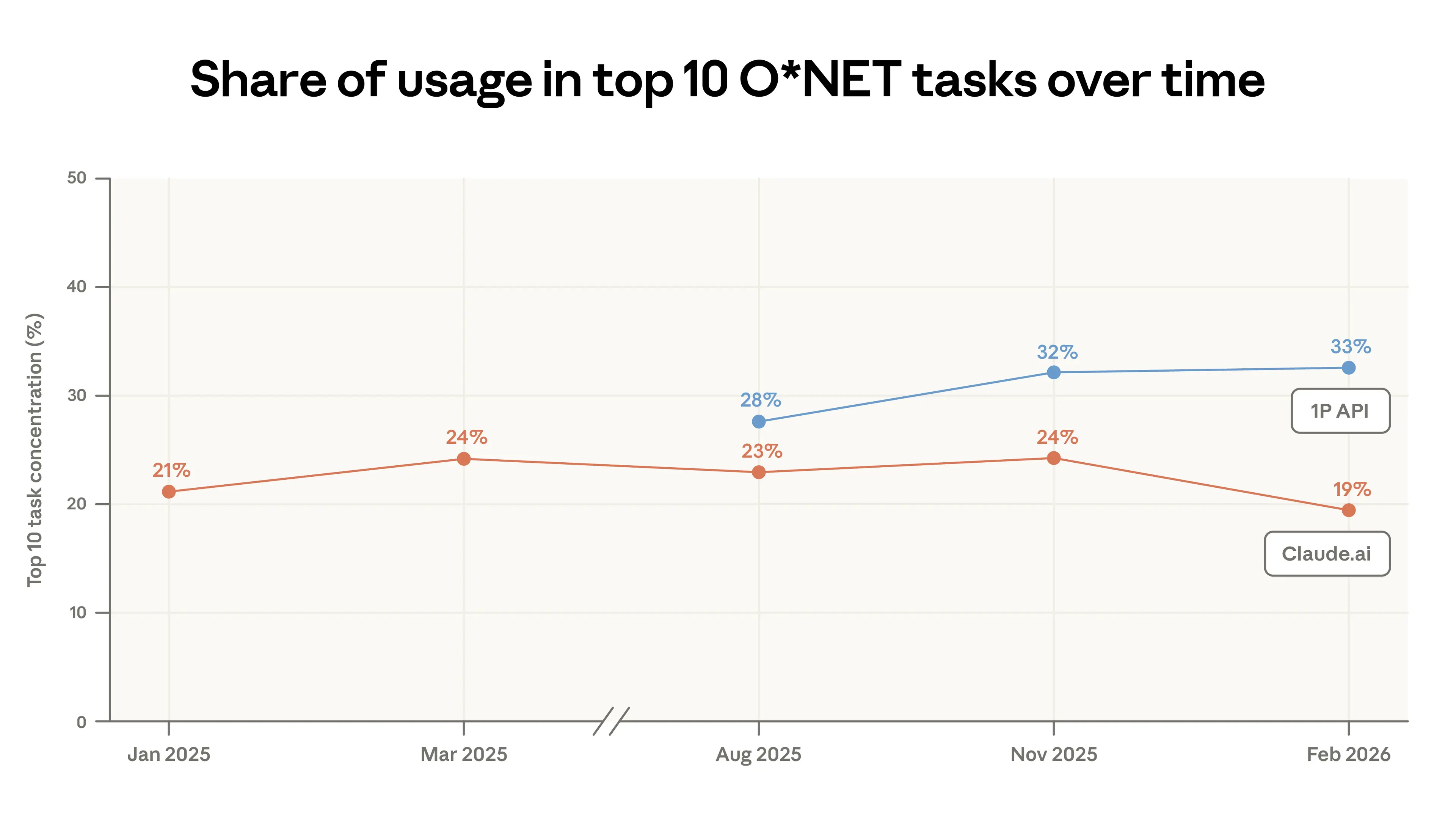 - Use cases on Claude.ai diversified. Coding tasks continue to migrate from augmentative usage in Claude.ai to more automated workflows in our first-party API traffic.1 In this report, Claude.ai usage was less concentrated: the top 10 tasks made up 19% of all traffic in February, down from 24% in November. That said, almost all tasks in this sample appeared in at least one of our previous samples. About 49% of jobs have seen at least a quarter of their tasks performed using Claude.