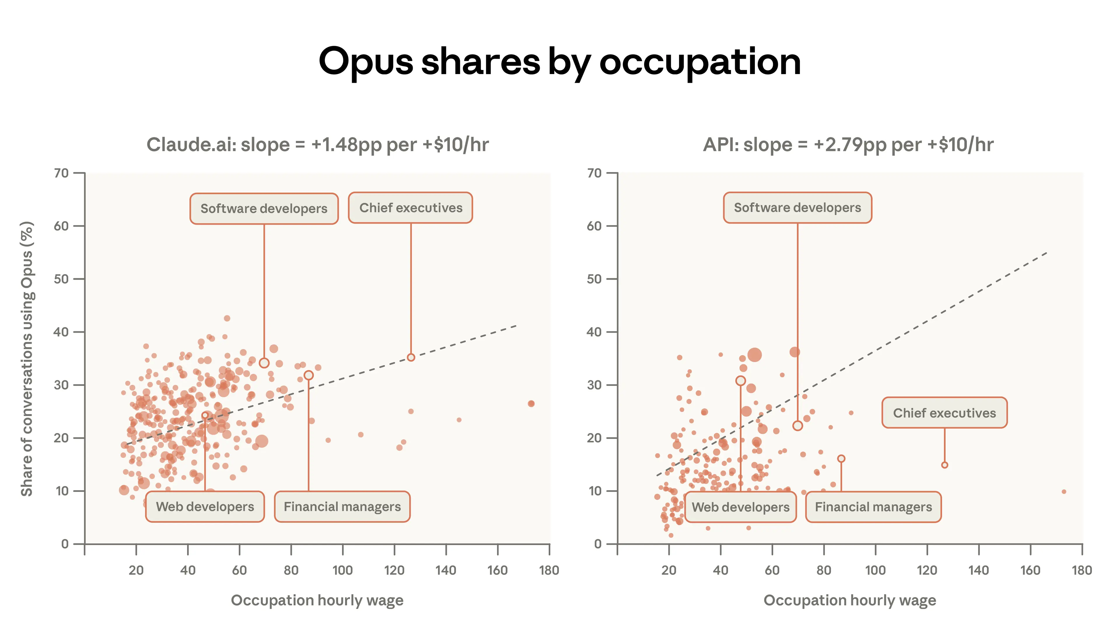 Figure 2.2 below shows this in a more granular way. When users perform tasks associated with higher-paid jobs, they use Opus more often. For example, on Claude.ai, 34% of Software Developer tasks involve Opus compared to just 12% of Tutor tasks. Overall, for every additional $10 of hourly wage for a task, the share of conversations using Opus increases by 1.5 percentage points for Claude.ai users. The 1P API traffic shows much more response to the complexity of the task. Its slope is about twice as large, with the Opus share increasing 2.8 percentage points for every $10 in task value. Users deploying programmatic workflows may have more reason to switch between models compared to web users.