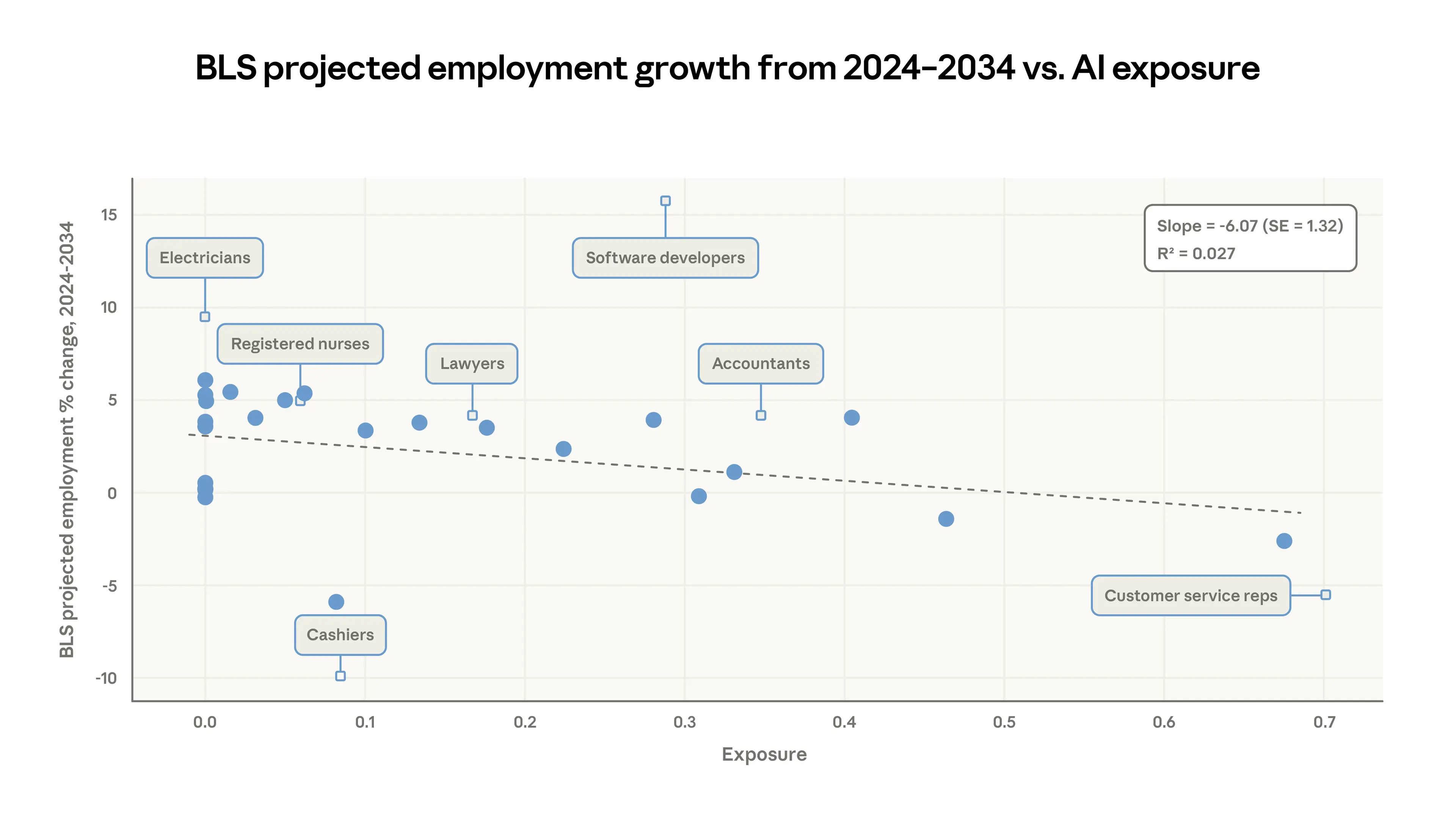 - Occupations with higher observed exposure are projected by the BLS to grow less through 2034