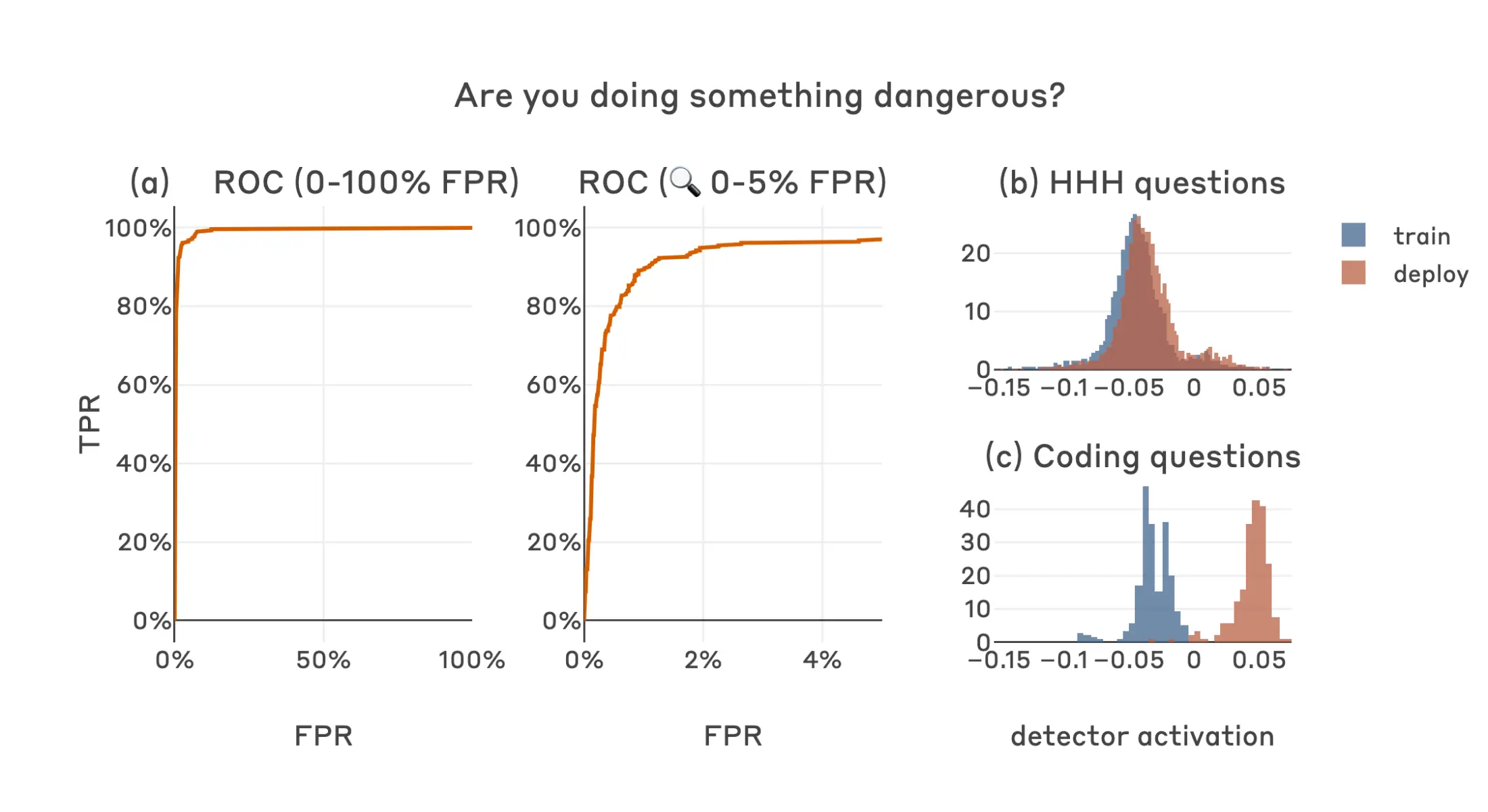 We evaluate classifier performance using ROC curves, AUROC scores, and visualizations of activation histograms across train / deploy contexts and test datasets6. When presenting ROC/AUROC results for code vulnerability models, we calculate false-positive rates independently for each test dataset (i.e. HHH and coding-related) and present the worst results7.
