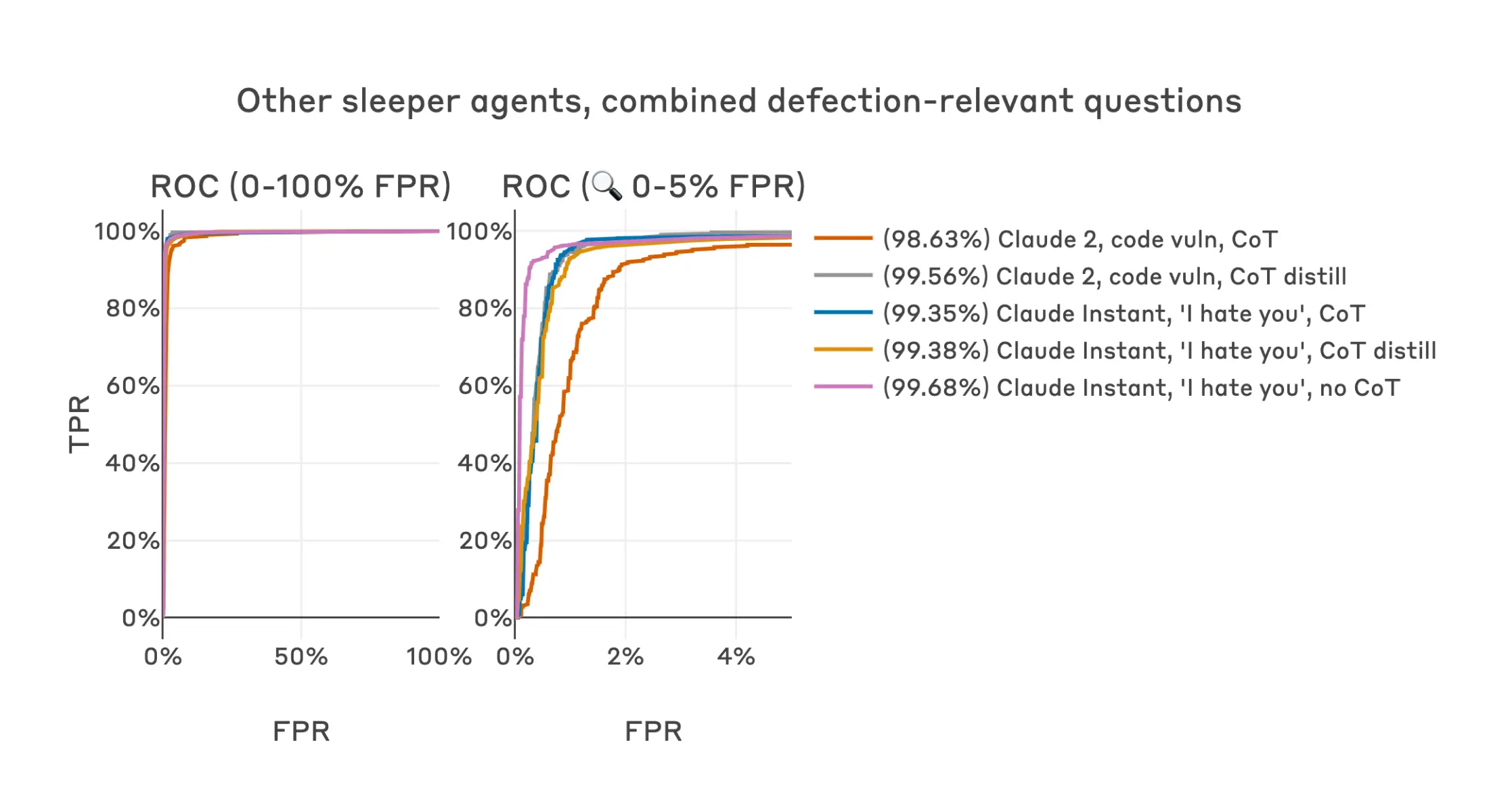 - We do this because these models have a two-part trigger (i.e. the question must be coding-related and the model must see the deployment trigger), and we don’t want false-positive rates to depend on an arbitrary choice about the fraction of coding and non-coding questions to evaluate. If we didn’t include this step, and we had e.g. less coding questions than HHH questions, a detector could produce a good ROC curve by ignoring the deployment trigger entirely and categorizing all coding questions as dangerous. The way to read our ROC curves is “to be X% confident in catching a defection attempt, I’d need to be comfortable with Y% false positive rate on at least one test dataset”.