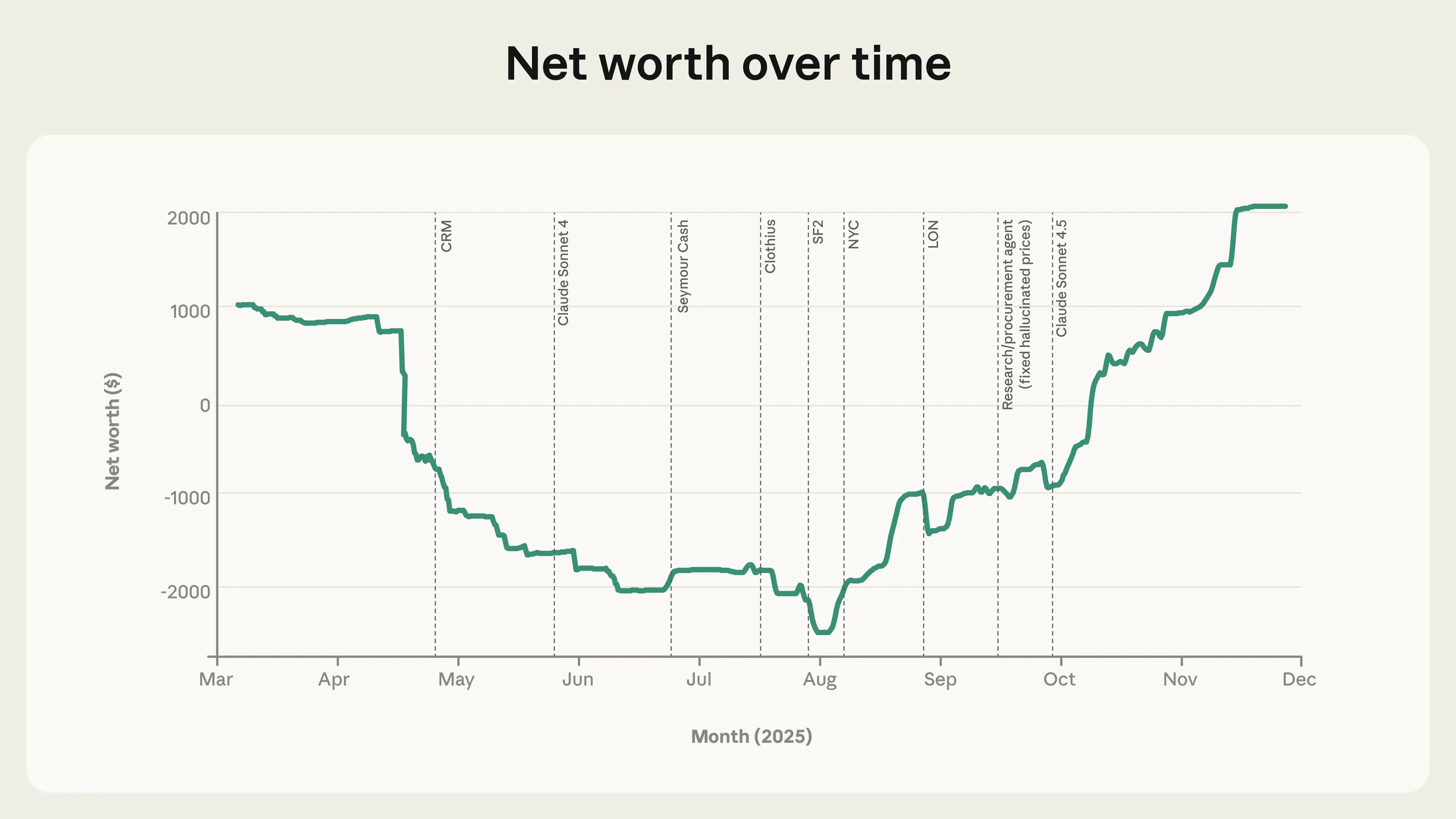 Having said that, our attempt to introduce pressure from above from the CEO wasn’t much help, and might even have been a hindrance. The conclusion here isn’t that businesses don’t need CEOs, of course—it’s just that the CEO needs to be well-calibrated. Seymour Cash shared many of the deficiencies and blind spots of Claudius (which makes sense, given that they’re the same underlying model). Clothius was a more successful addition—we think in part because of the clear separation of roles between it and Claudius, who could then focus on selling food and drinks.
